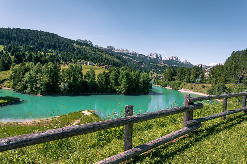 Near Lake Pezzè, a reservoir with turquoise waters, stands Soraga (1207 m), one of the oldest municipalities in the Fassa Valley. The peculiarity of this village is its location: geographically, it is separate from the boundaries of the town from the Alpe di Fuciade to the San Pellegrino Pass, the mountain pasture at the foot of the Costabella. This peaceful village is framed by the Roda di Vael (2804 m), the Cima Dodici (2446 m) and the Dirupi di Larséch (2734 m).