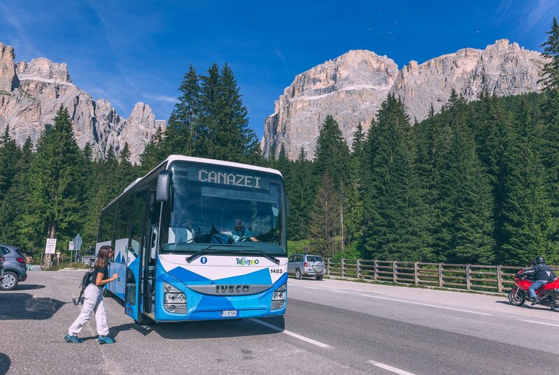 After booking in one of the affiliated facilities, request and activate the Val di Fassa Guest Card straight away. When you are in the valley, you can travel freely on the buses of Trentino Trasporti and südtirolmobil* for the duration of your holiday. All you have to do is use the Mio Trentino App > Transport > Travel with Guest Card > Validate your ride. Everything is included in the card!