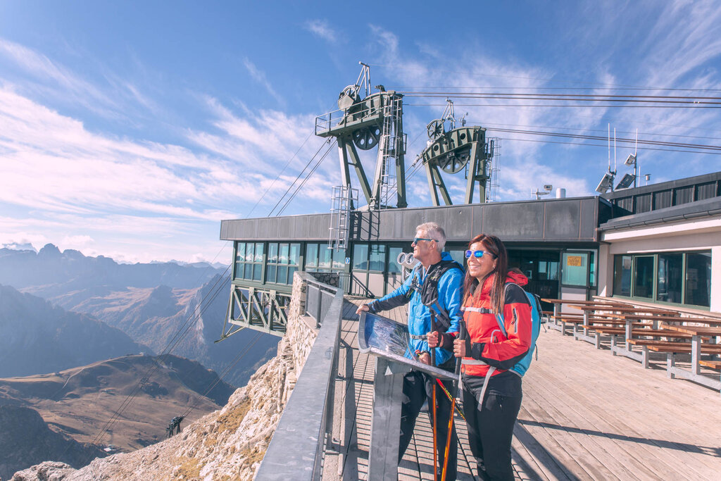 At the arrival of the cable car that goes up from the Pordoi Pass (2239 meters) to the Sass Pordoi (2950 meters), there is the Rifugio Maria with its famous Terrace of the Dolomites.