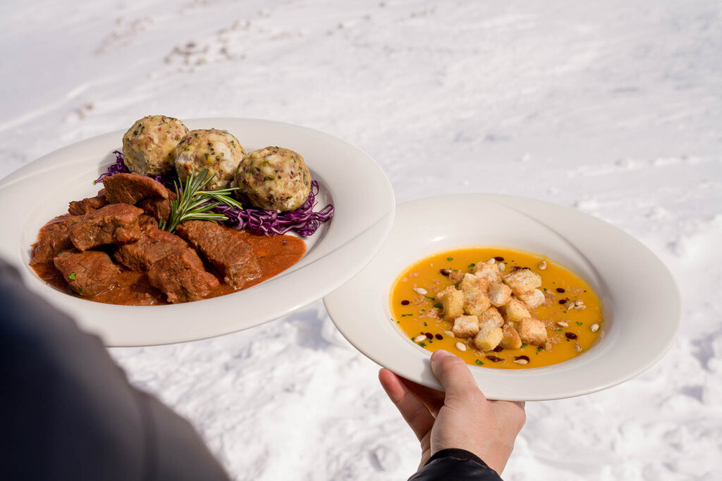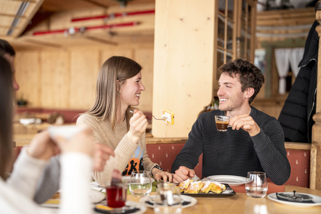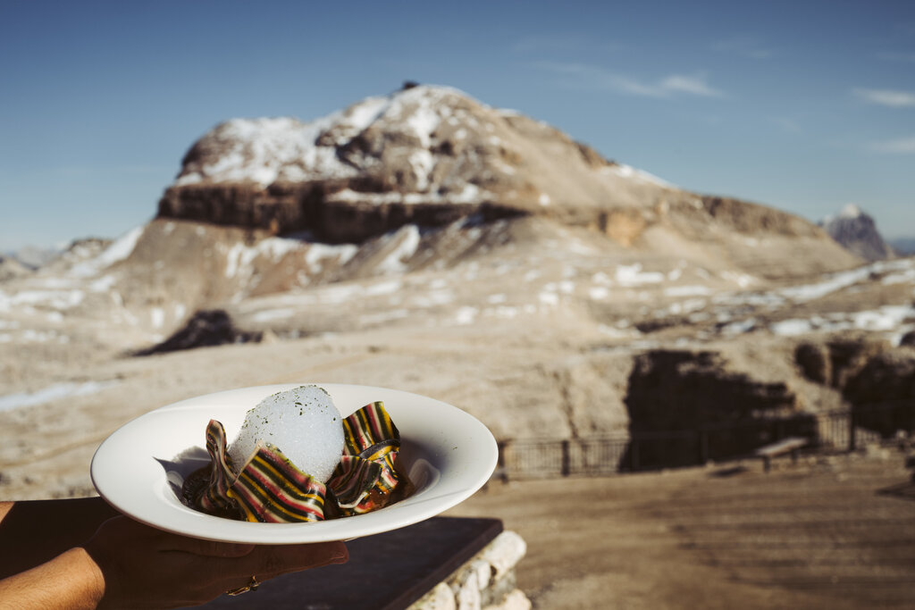 It is a unique place in the world, which is absolutely worth a visit for the 360° view of the Dolomites: the gaze stretches from the nearby groups of the Marmolada and the Sassolungo, to the Tofane, to the Pale di San Martino up to the Austrian and Swiss Alps. From Sass Pordoi several excursions start in summer, including the ascent to Piz Boè (3150 meters), while in winter challenging freeride and ski mountaineering itineraries. The Rifugio Maria, a welcoming place with large windows that allow lunches and snacks with exceptional views, offers a wide choice of Italian and traditional Ladin dishes, with also vegetarian variants. At almost 3,000 metres, the palate is delighted, among other things, with platters of cured meats and cheeses, canederli, tagliatelle with game ragout, goulash with polenta, beef entrecote with salad and hot vegetables and also with the highly recommended "carne salada". Desserts are also excellent, from traditional strudel with vanilla sauce, to apple pie, to panna cotta with berries. Those who wish can consume salads or hot sandwiches and savour national and international wines and even craft beers.
