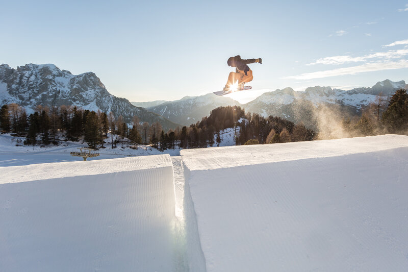 Fun is the keyword by our snow parks. The most enthusiastic rookies, the rider crews, the passionate snowboarders and the freestyle skiers find in Val di Fassa 8 dedicated, groomed every day and well equipped areas with jumps, rails, boarders and kickers. Here you can go wild, jumping and making acrobatics.